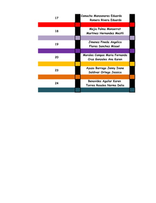 El documento presenta una lista de equipos de trabajo para un proyecto, con los nombres de los integrantes de cada equipo numerado del 2 al 24. También incluye una tabla con detalles de canciones musicales como el género, intérprete, canción, año de lanzamiento, número de discografía y si incluye biografía o foto.