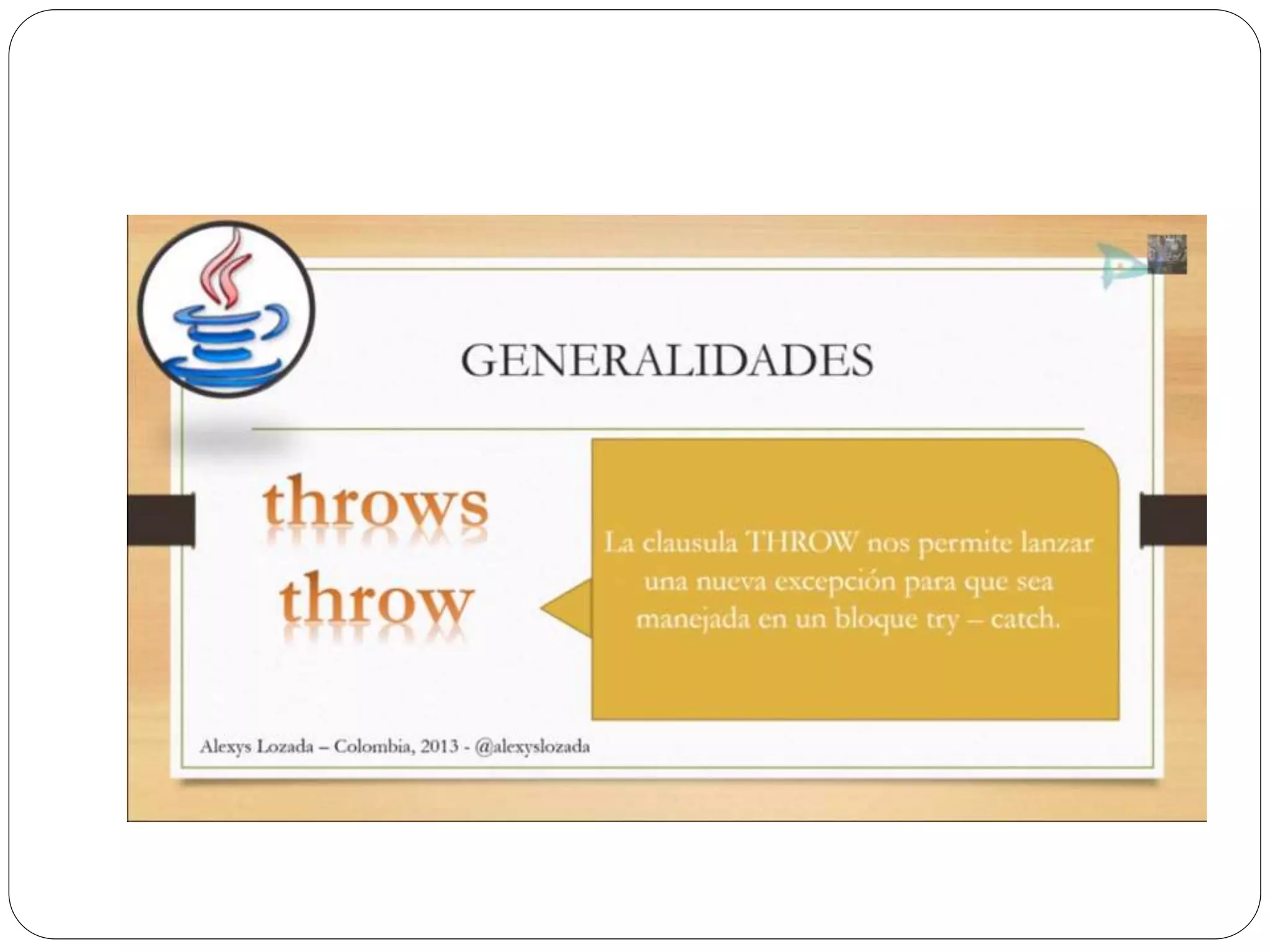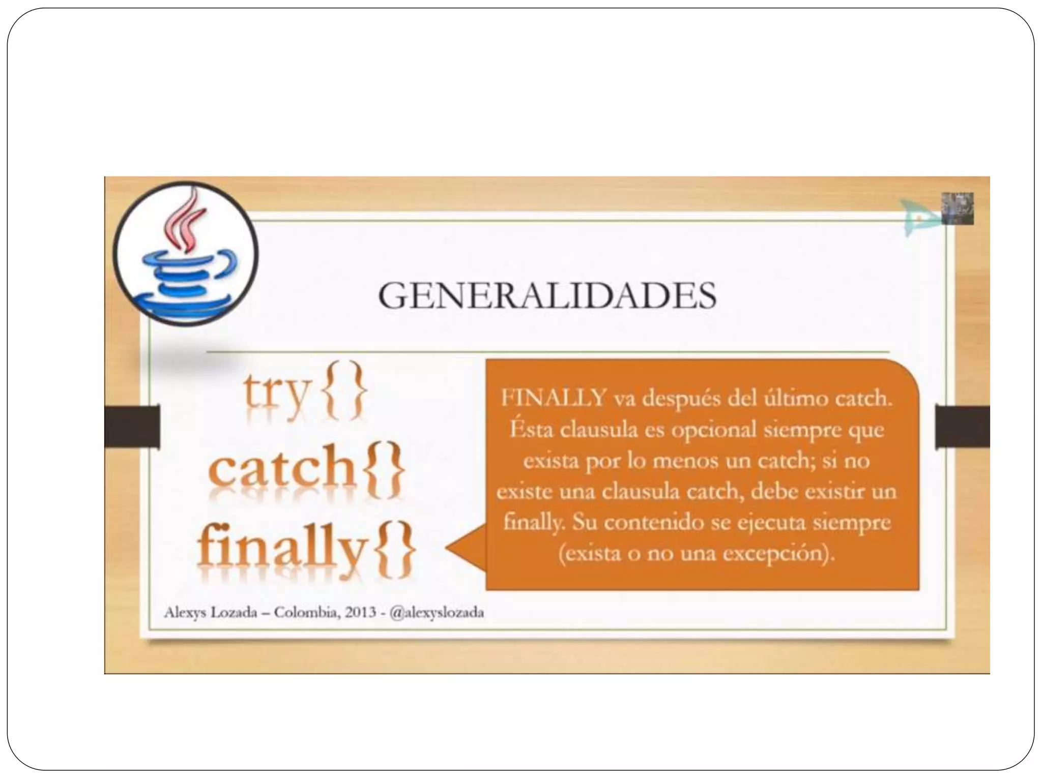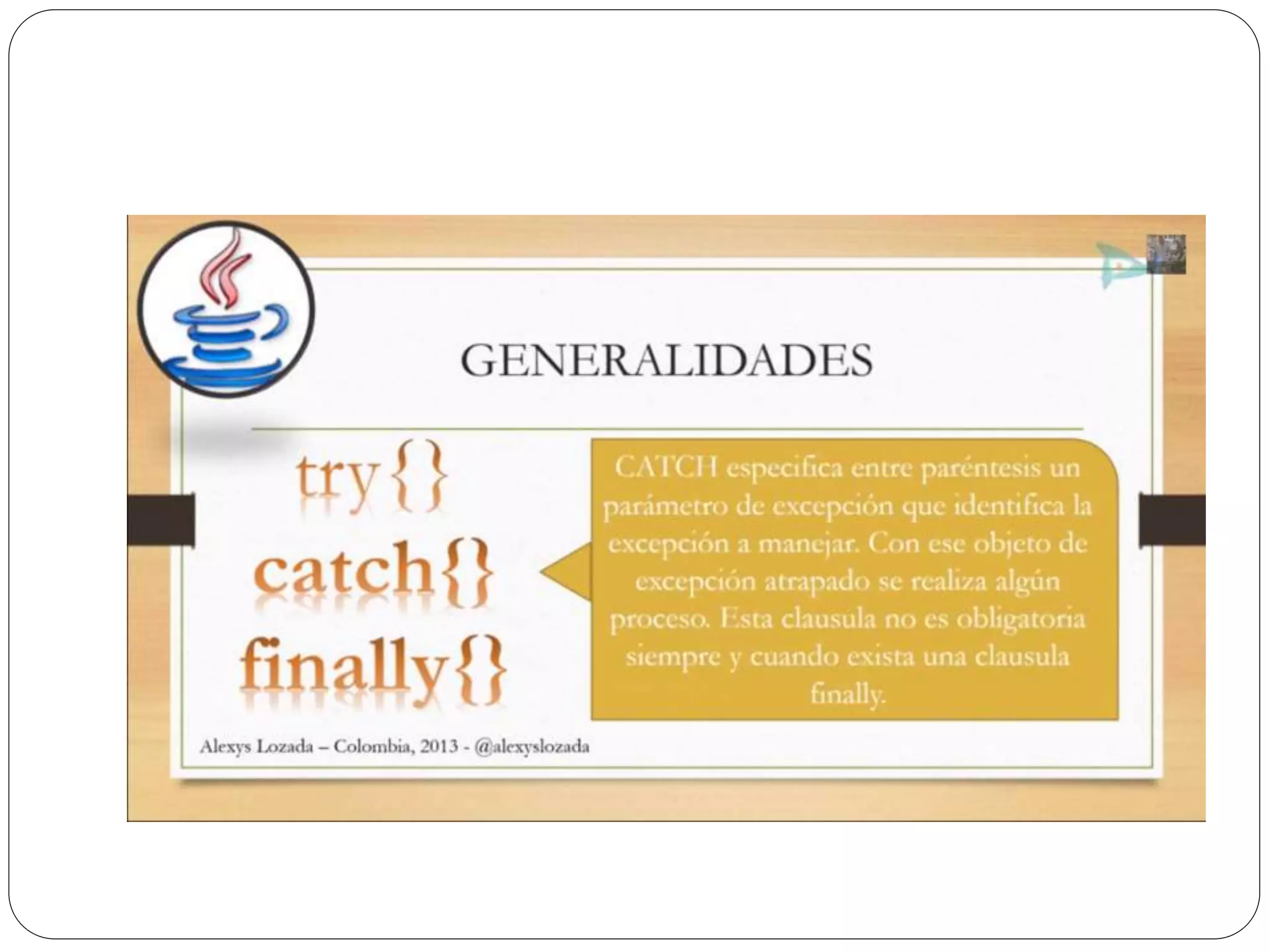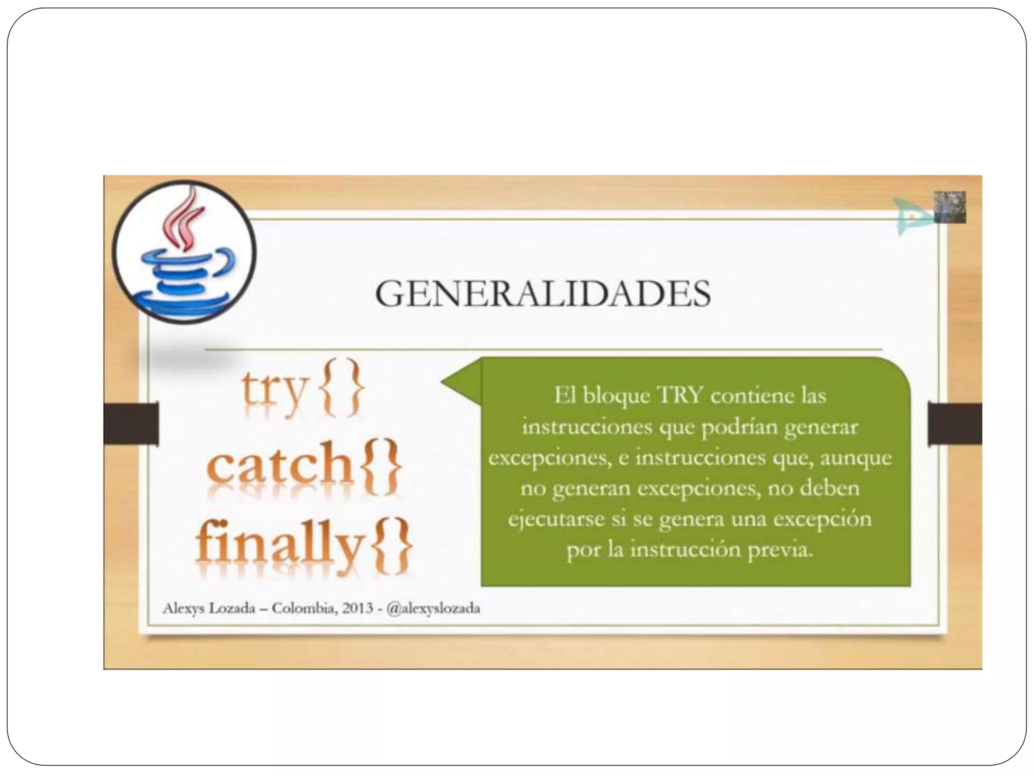 Las excepciones en Java permiten atrapar y manejar errores en tiempo de ejecución como divisiones entre cero o ingreso de texto en lugar de números. Se usa un bloque try para rodear el código que puede generar excepciones, y bloques catch para especificar cómo manejar diferentes tipos de excepciones. Finalmente se puede usar un bloque finally para ejecutar código independientemente de si se lanza una excepción o no.