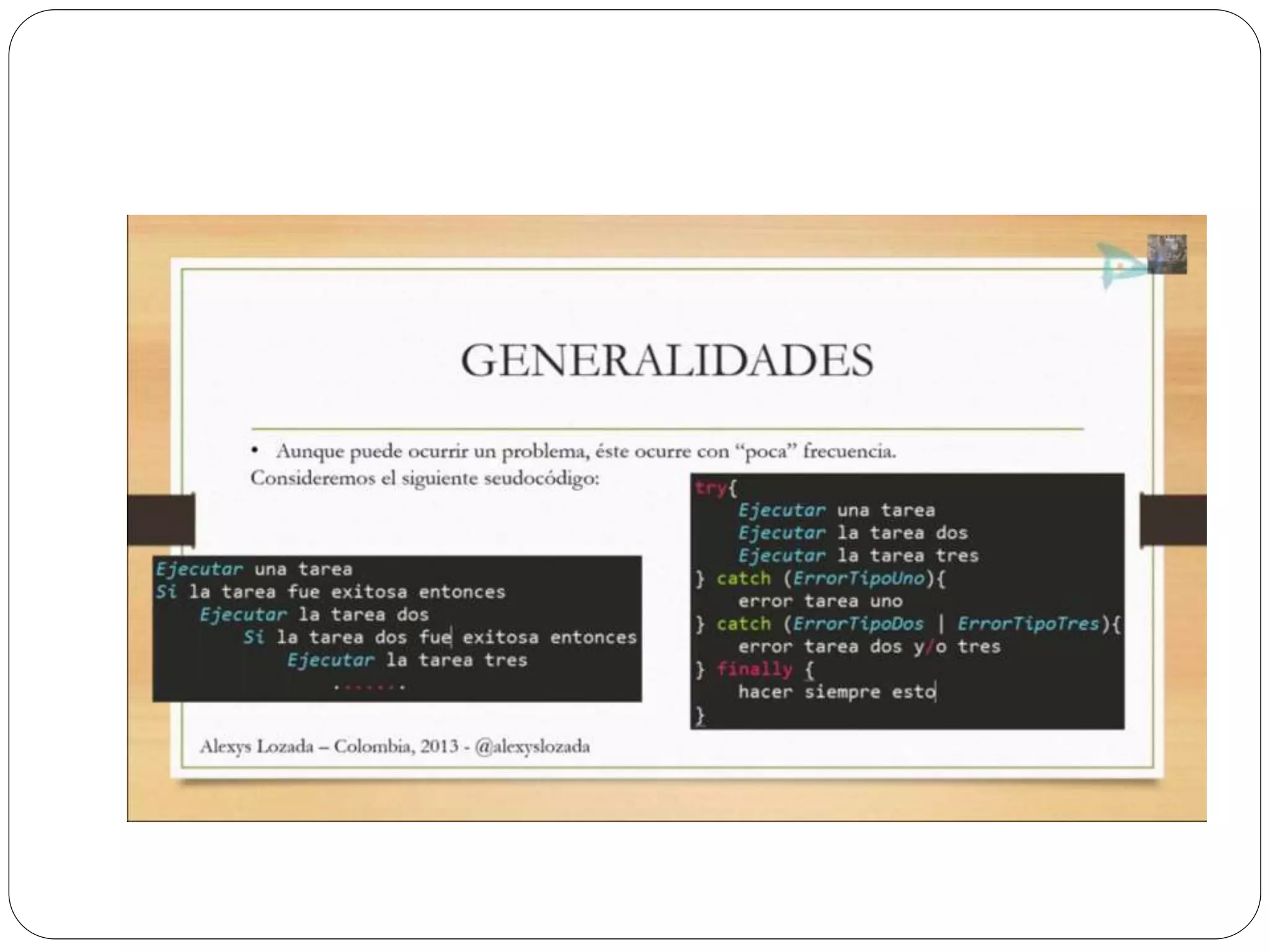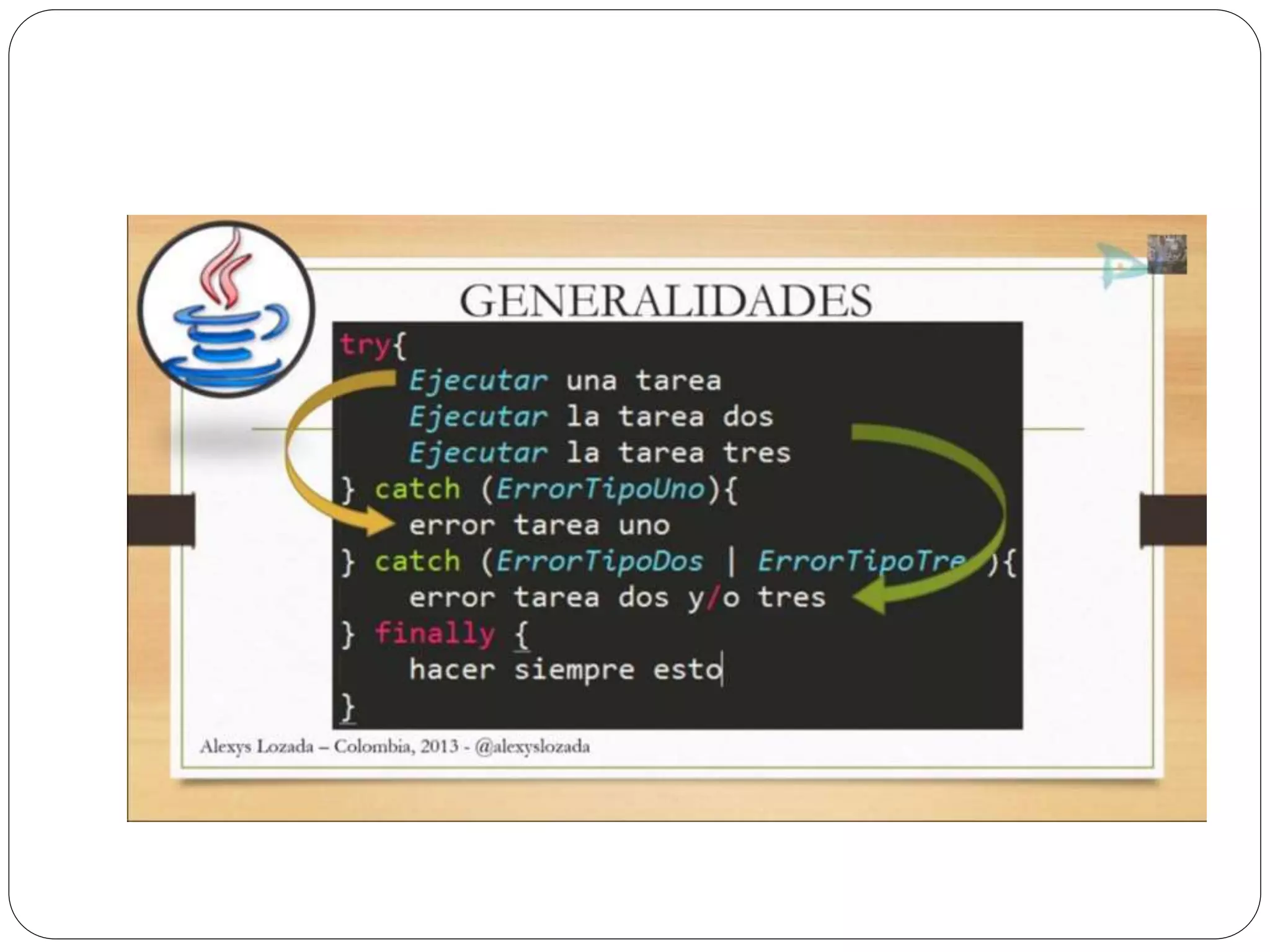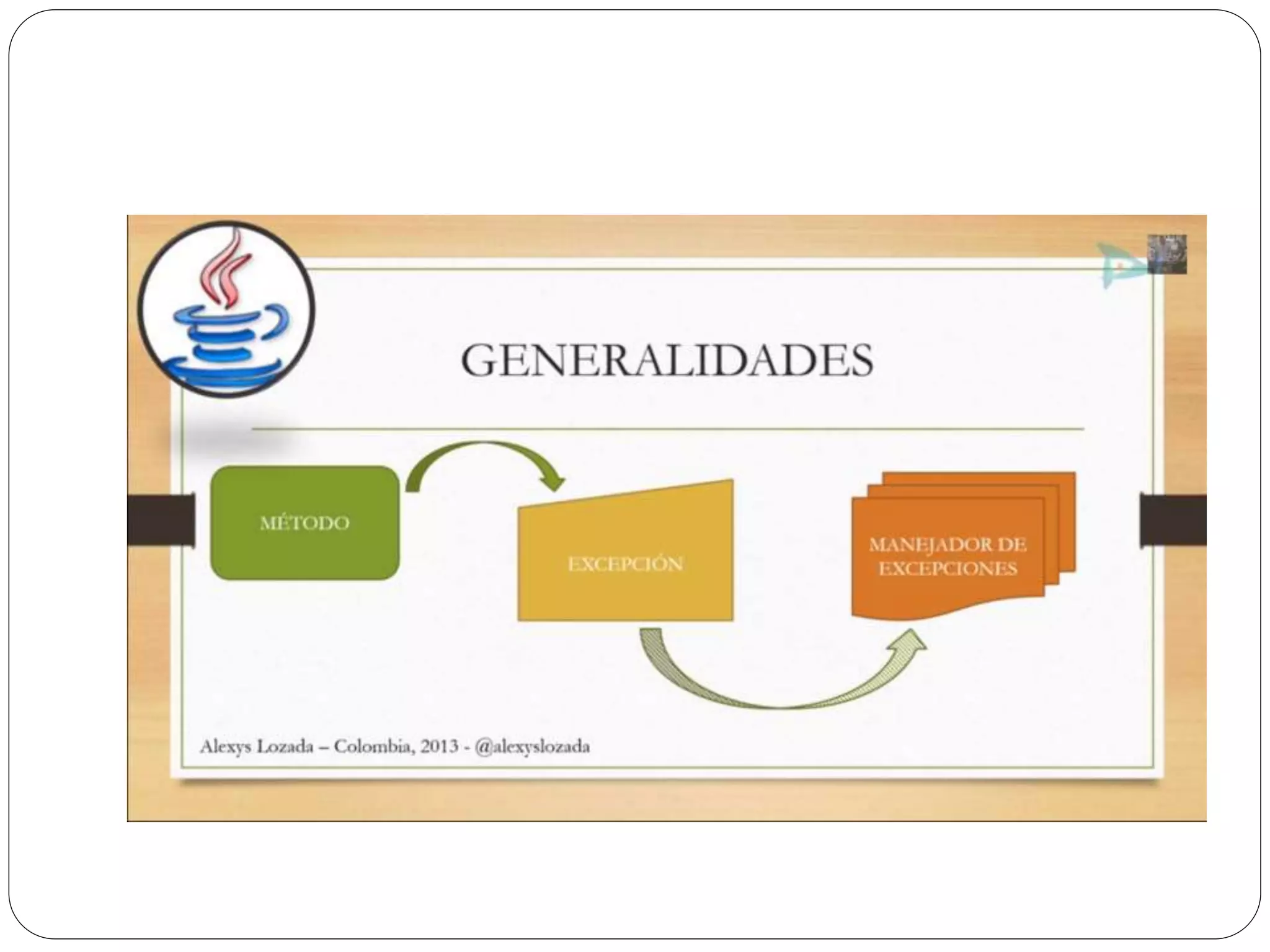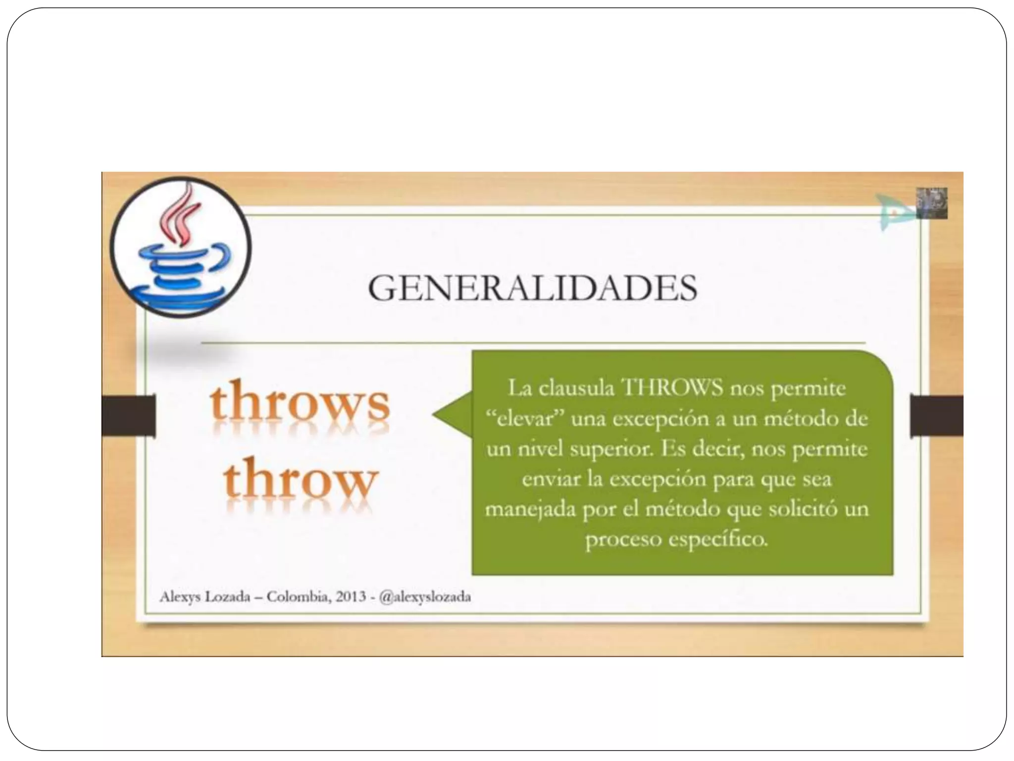 Las excepciones en Java permiten atrapar y manejar errores en tiempo de ejecución como divisiones entre cero o ingreso de texto en lugar de números. Se usa un bloque try para rodear el código que puede generar excepciones, y bloques catch para especificar cómo manejar diferentes tipos de excepciones. Finalmente se puede usar un bloque finally para ejecutar código independientemente de si se lanza una excepción o no.