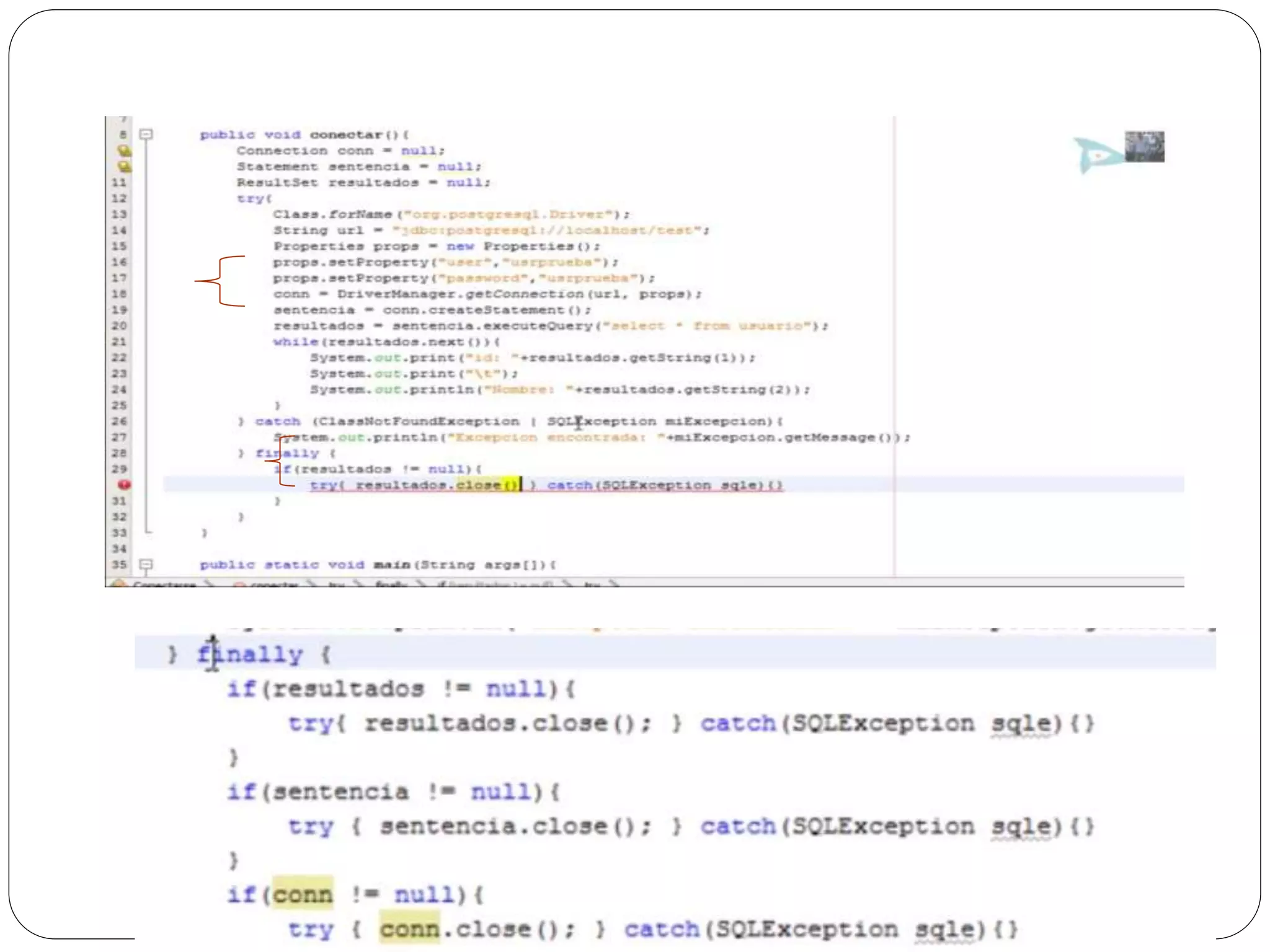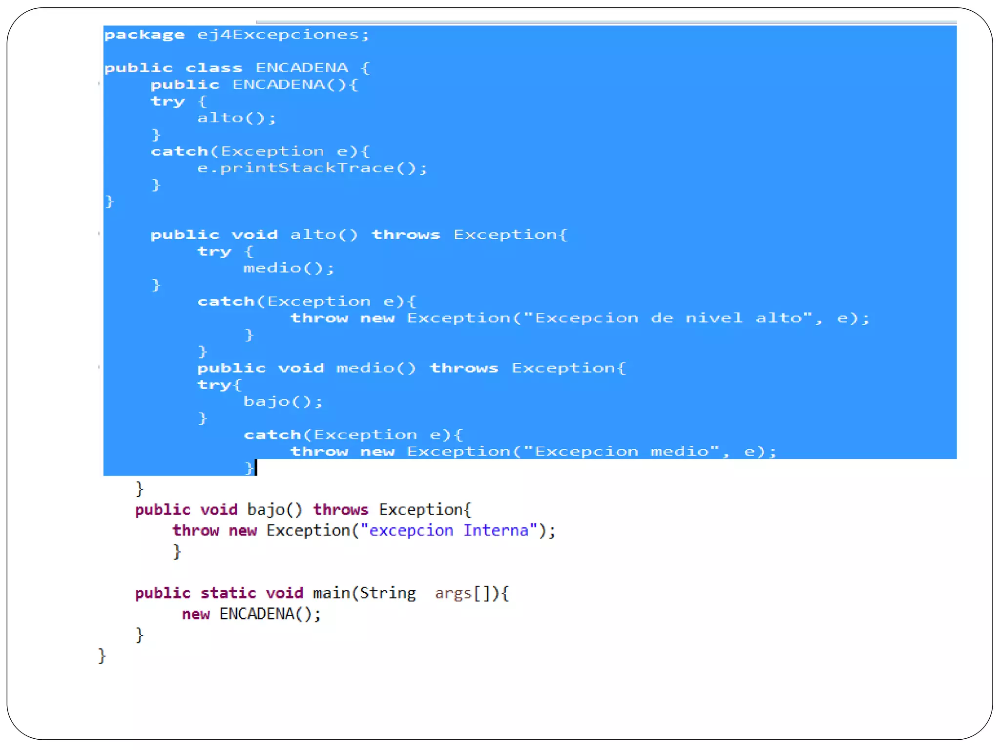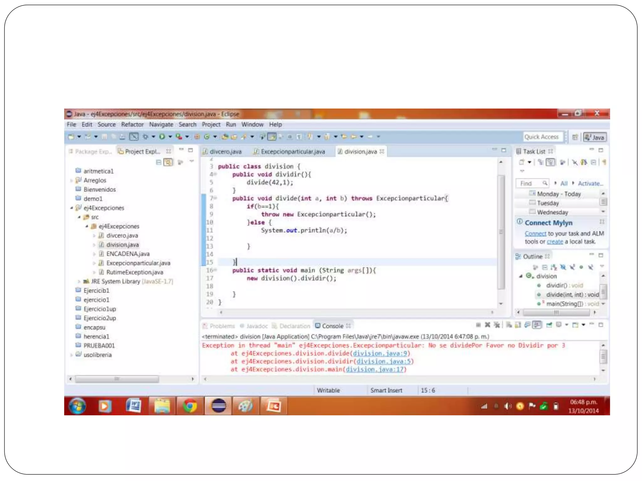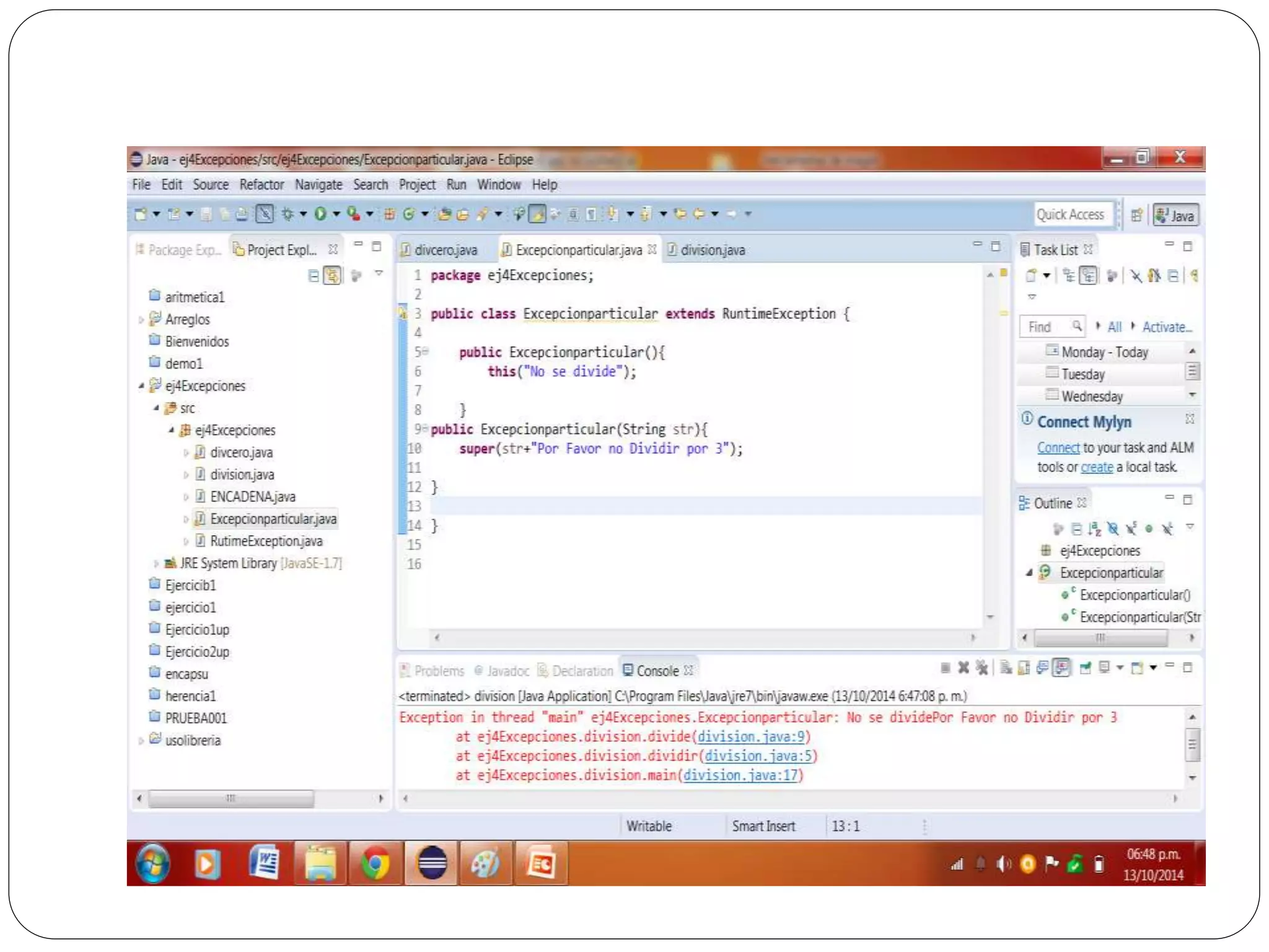 Las excepciones en Java permiten atrapar y manejar errores en tiempo de ejecución como divisiones entre cero o ingreso de texto en lugar de números. Se usa un bloque try para rodear el código que puede generar excepciones, y bloques catch para especificar cómo manejar diferentes tipos de excepciones. Finalmente se puede usar un bloque finally para ejecutar código independientemente de si se lanza una excepción o no.