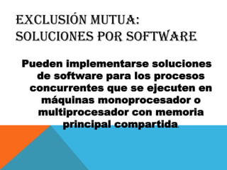 Las soluciones de software para la exclusión mutua incluyen algoritmos como el de Deker y Peterson que utilizan variables globales para que los procesos concurrentes se coordinen y eviten el acceso simultáneo a las secciones críticas. También se presentan soluciones de hardware como inhabilitar interrupciones en sistemas monoprocesador, aunque esto reduce la eficiencia y no funciona en sistemas multiprocesador.