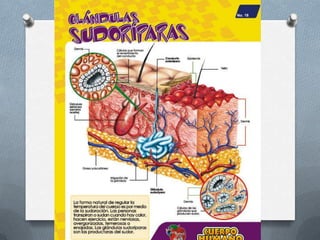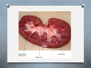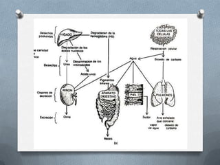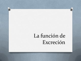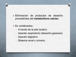 El documento describe las funciones de excreción en los vertebrados, incluyendo la eliminación de dióxido de carbono a través de los pulmones, agua y sales a través de los riñones, y derivados nitrogenados como la urea, ácido úrico y amoníaco. Explica que los riñones contienen unidades funcionales llamadas nefronas que filtran la sangre para formar la orina a través de la filtración glomerular, reabsorción y secreción tubular. También cubre los diferentes tipos de osmorregulación en