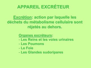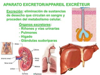 El riñón es el órgano principal del aparato excretor. Elimina los desechos del metabolismo celular mediante un proceso de filtración, reabsorción y secreción. La nefrona es la unidad funcional del riñón y está compuesta por la cápsula de Bowman y los túbulos renales. La orina final se forma a medida que el agua y electrolitos son reabsorbidos dejando los desechos como la urea. Los pulmones, hígado y glándulas sudoríparas también desempeñan un papel