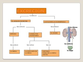 El sistema excretor está formado principalmente por los riñones, que filtran la sangre para producir la orina y eliminar desechos, y las vías urinarias como los uréteres y la vejiga que transportan y almacenan la orina antes de su eliminación. Otros órganos excretores son las glándulas sudoríparas de la piel, los pulmones que eliminan dióxido de carbono, e indirectamente el hígado y el intestino grueso.