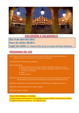 El documento detalla el itinerario y programa de una excursión a Salamanca el 6 de abril de 2013 que incluye una visita guiada de la ciudad, una comida, una presentación sobre un viaje a Tierra Santa, una misa en un convento y el regreso a Madrid. El precio por persona es de 35 euros y la plaza se confirma una vez realizado el pago.