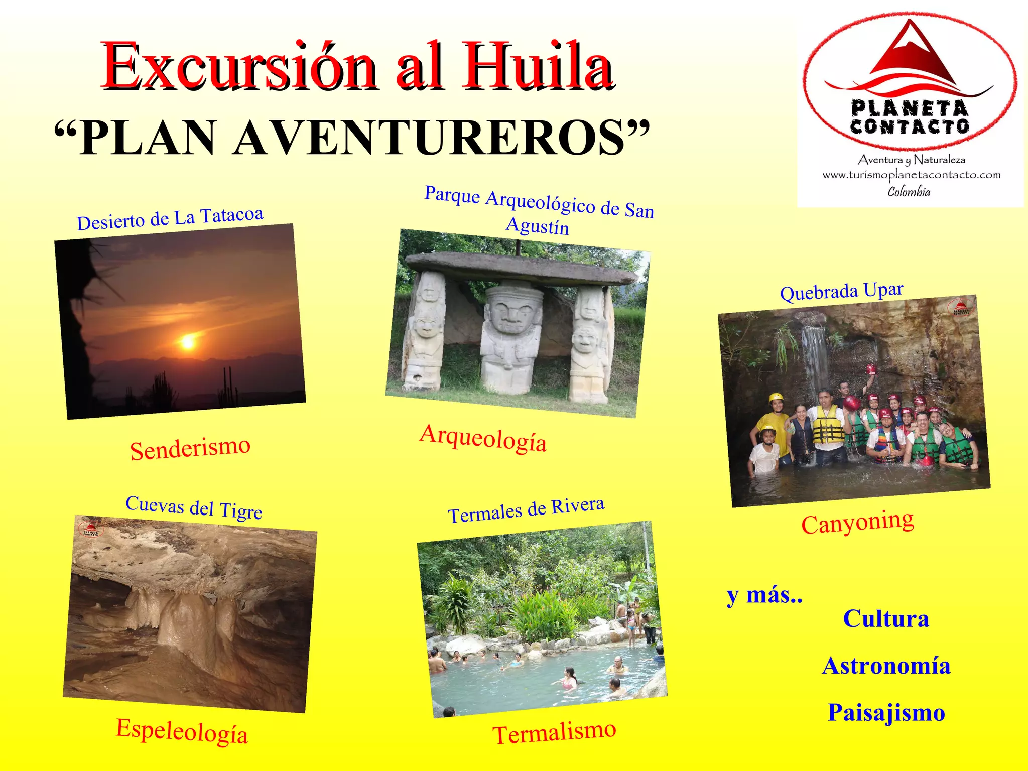 El documento describe un plan de aventura en el departamento de Huila, Colombia, que incluye senderismo arqueológico en el Parque Arqueológico de San Agustín, espeleología en la Cueva del Tigre, canyoning en la Quebrada Upar, observación de estrellas en el Desierto de La Tatacoa, baños termales en Rivera, y más. El Parque Arqueológico de San Agustín es Patrimonio de la Humanidad por su importancia arqueológica. La Cueva del Tigre contiene