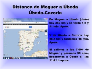 Este documento proporciona información sobre un viaje de fin de curso de Moguer a Cazorla. Detalla las distancias y tiempos de viaje entre las ciudades, así como los lugares por los que pasarán. También describe el sistema montañoso y el río más importante de Cazorla, así como sus principales monumentos, tradiciones y gastronomía local.