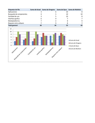 El documento compara cuatro programas de diseño electrónico (kicad, Oregano, Qucs y Multisin) según seis categorías como facilidad de uso, búsqueda de componentes, requerir otro software, etc. Se calculan las sumas totales por programa que van de 30 a 53 puntos, siendo Qucs el que obtiene la mayor suma y por lo tanto el mejor valorado según estos criterios.