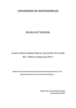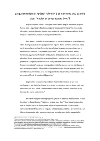 Este documento analiza el versículo 1 Corintios 14:2 donde el apóstol Pablo dice "hablar en lenguas para Dios". Explora dos posibles interpretaciones: que se refiere a una comunicación privada con Dios o a hablar en idiomas desconocidos para predicar el evangelio. Luego resume varias perspectivas teológicas sobre el don de lenguas y concluye que la Biblia no lo presenta como una evidencia indispensable de haber recibido el Espíritu Santo.