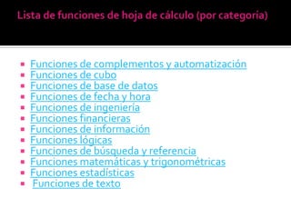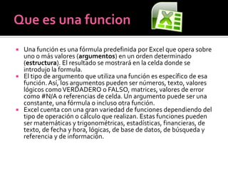 Una función en Excel es una fórmula predefinida que opera sobre valores de entrada para producir un resultado. Existen muchos tipos de funciones como matemáticas, estadísticas, financieras y de texto que operan sobre números, texto, lógicos y referencias de celdas. Algunas funciones comunes extraen datos de bases de datos o llaman a procedimientos externos.