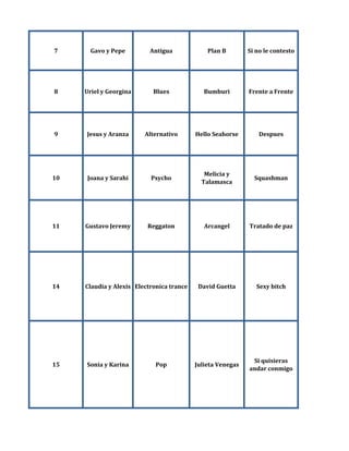 El documento lista 26 equipos de músicos con su género musical, intérprete, canción, año de lanzamiento y número de discografía. Incluye breves biografías de varios artistas como Julieta Venegas, Reik, Guns N' Roses, Chico Che y la crisis y Ricardo Arjona.