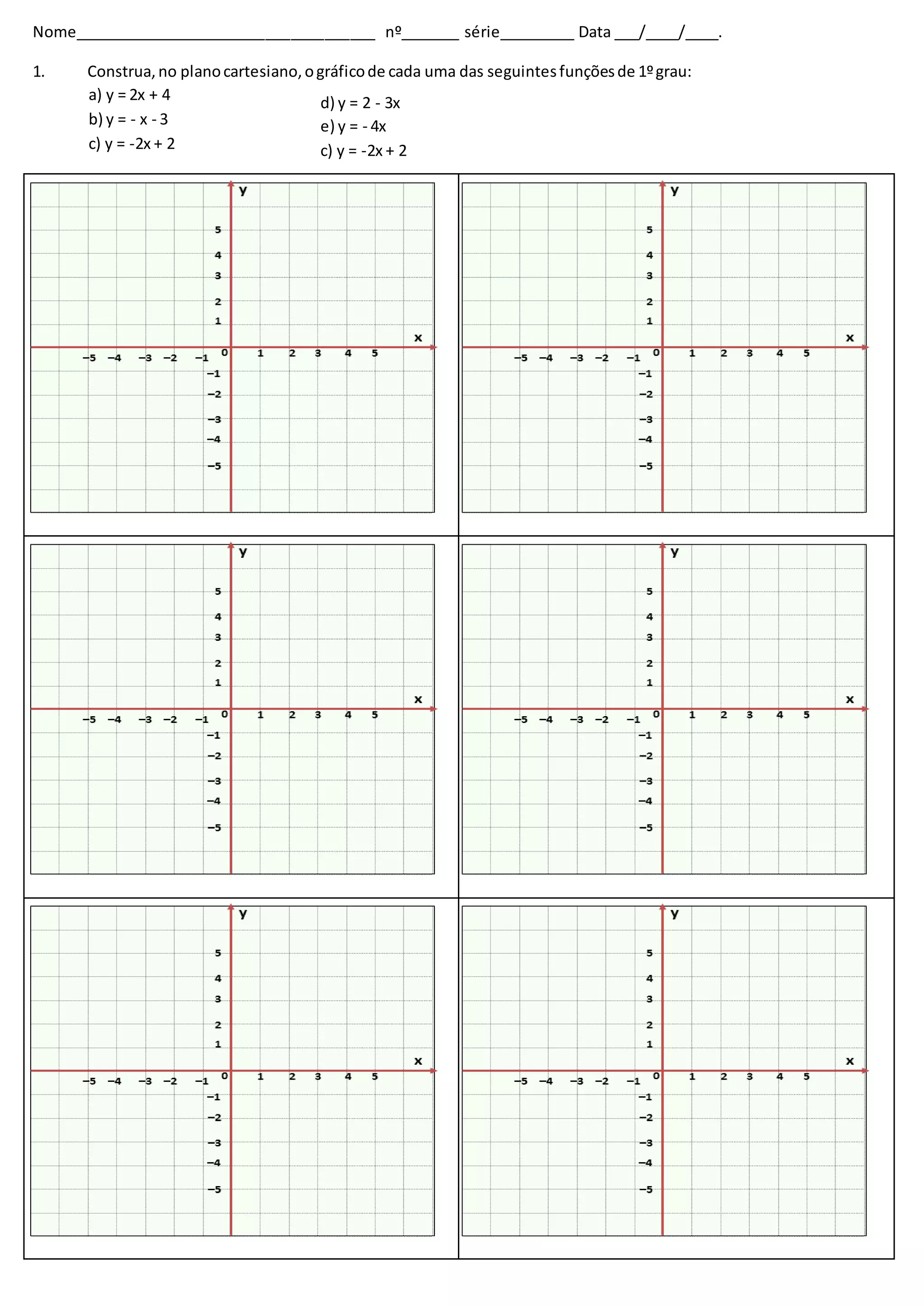 El documento pide al estudiante construir gráficos de cinco funciones lineales en el plano cartesiano. Las funciones son: a) y = 2x + 4, b) y = -x - 3, c) y = -2x + 2, d) y = 2 - 3x, e) y = -4x. El estudiante debe completar las tablas de valores y gráficos para cada función.
