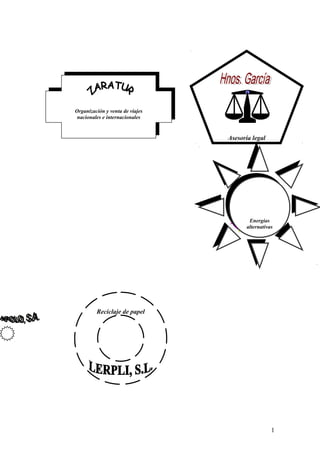Este documento trata brevemente sobre la organización y venta de viajes nacionales e internacionales, asesoría legal, energías alternativas y reciclaje de papel.