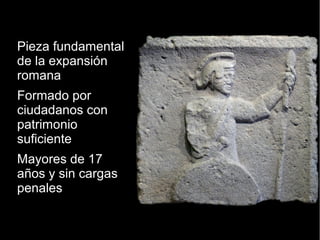 El ejército romano era una pieza fundamental de la expansión del Imperio Romano. Estaba formado inicialmente por ciudadanos romanos entre 17 y 46 años, aunque luego se permitió el reclutamiento de extranjeros. El ejército pasó de ser una milicia ciudadana a una fuerza profesional. Estaba compuesto por legiones de infantería y unidades de caballería auxiliares, con una estructura jerárquica clara y un equipamiento estandarizado.