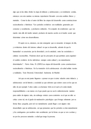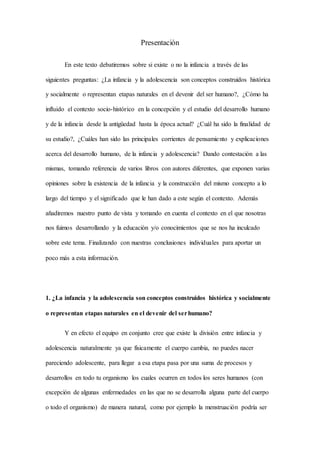 El documento presenta un debate sobre si la infancia y la adolescencia son conceptos construidos histórica y socialmente o representan etapas naturales en el desarrollo humano. Plantea varias preguntas como influye el contexto socio-histórico en la concepción de la infancia y las principales corrientes de pensamiento sobre el desarrollo humano. El equipo concluye que si bien existen cambios físicos naturales, la sociedad ha construido los conceptos e influye en su estudio. Existen varias opiniones sobre si es un proceso natural o