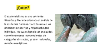 El existencialismo es una corriente filosófica que se centra en los problemas fundamentales de la existencia humana, como la libertad, la responsabilidad individual y la angustia existencial. Se opone al racionalismo y enfatiza que la existencia precede a la esencia. Representantes clave incluyen a Sartre, Camus, Kierkegaard y Nietzsche.
