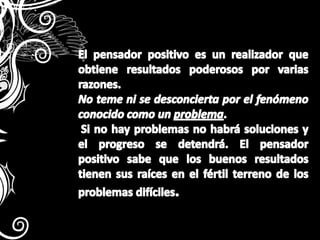 El documento discute varios problemas personales como el miedo y la ansiedad, y propone formas de abordarlos. Sugieren que infundir fe en uno mismo, los demás y las soluciones puede ayudar a superar los problemas. También argumentan que mantener un enfoque positivo evita que los problemas parezcan aterradores, y en su lugar los ve como desafíos que contienen soluciones si se los enfrenta de manera inteligente y con esperanza.