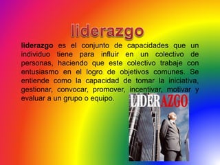 El documento define el liderazgo como la capacidad de influir en un grupo para lograr objetivos comunes. Explica que puede ser formal o informal, y dictatorial, autocrático, transaccional, auténtico o lateral dependiendo de la relación con el grupo y el tipo de influencia. Finalmente, define el éxito como el logro de los objetivos planeados o deseados que produce satisfacción y felicidad.