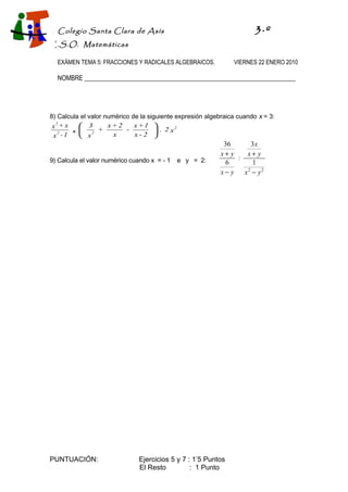 Este documento contiene un examen de matemáticas sobre fracciones y raíces algebraicas. Consiste en 9 preguntas que abarcan operaciones con expresiones radicales, equivalencia de fracciones, sumas y restas de fracciones y raíces, productos y cocientes de raíces, y evaluación de expresiones algebraicas para valores numéricos específicos de las variables.