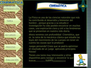 Este documento presenta una tarea de física para estudiantes de primer año de secundaria. La tarea involucra el uso de simuladores en línea para completar una tabla sobre cinemática, realizar un experimento de laboratorio y presentar ejercicios resueltos. Los estudiantes tienen una semana para completar la tarea y luego deben defender y demostrar sus resultados.