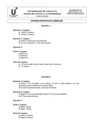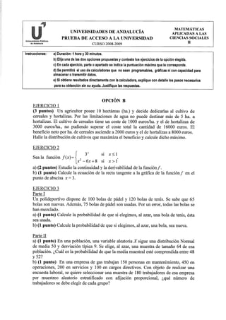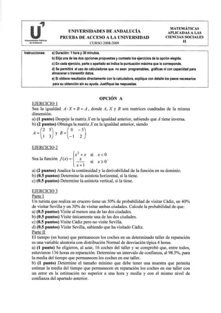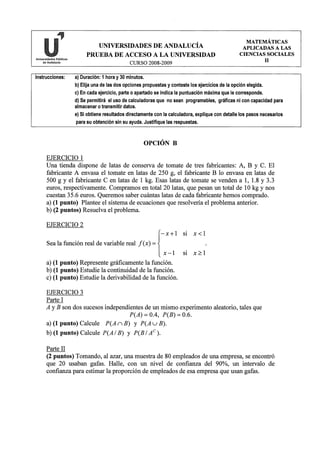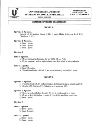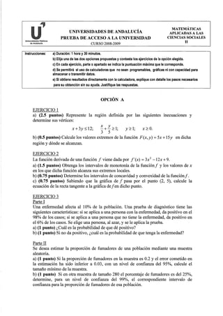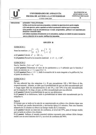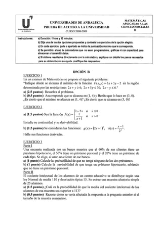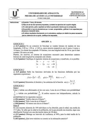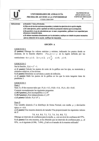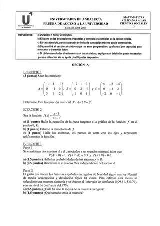 Este documento presenta una prueba de acceso a la universidad con dos opciones de ejercicios de matemáticas aplicadas a las ciencias sociales. Incluye instrucciones generales y tres ejercicios en cada opción con diferentes partes o apartados para resolver con diferentes puntuaciones asignadas.