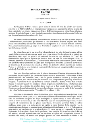 El documento presenta un análisis detallado del libro del Éxodo y la redención del pueblo de Israel. Resume que los hijos de Israel fueron llevados a Egipto debido a sus pecados, pero que Dios usó esto para cumplir sus planes de redención a través de José. Aunque Faraón oprimía a Israel, su crecimiento continuó porque Dios estaba en control. La fe es lo que permitió a Israel ver más allá de su sufrimiento actual y confiar en las promesas eternas de Dios.