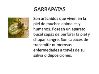 Este documento proporciona información sobre varios tipos de exoparásitos que afectan a los animales, incluidas garrapatas, piojos, niguas, moscas y moscas bravas. Describe sus características, ciclos de vida, síntomas que causan y formas de prevención y tratamiento. En particular, se enfoca en explicar cómo las garrapatas pueden transmitir enfermedades como la fiebre de las montañas rocosas y la enfermedad de Lyme, y los daños económicos significativos que pued