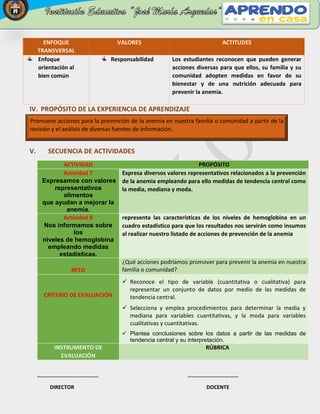 Este documento describe una experiencia de aprendizaje sobre la prevención de la anemia en Matemática para grados 1° y 2°. El problema es que aproximadamente el 40.1% de niños menores de 3 años en la comunidad de Auque Bajo sufren de anemia. Los estudiantes explorarán el problema de la anemia, reconocerán si existe este riesgo en su familia o comunidad, y propondrán acciones para prevenirla. A través de actividades, los estudiantes expresarán valores relacionados a la prevención de la anemia usando medidas