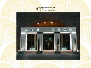 El Art Decó surgió en París en 1925 como resultado de una exposición dedicada a las artes decorativas e industriales modernas. Se caracterizó por formas geométricas y estilizadas, colores brillantes, y la inspiración en motivos de la naturaleza, la máquina y culturas antiguas. Influyó en la arquitectura, el diseño y el mobiliario entre los años 1920 y 1950 con dos estilos principales: el zigzag y el streamline.