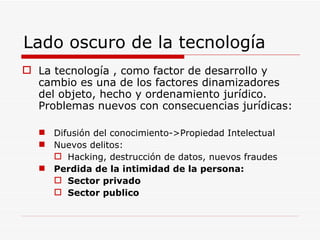 El documento discute la evolución del derecho a la protección de datos personales ante los avances tecnológicos. Explica que ahora los datos personales son un nuevo objeto de protección y que se requiere legislación internacional armonizada debido a que los datos pueden transferirse fácilmente entre países. También resume los principios fundamentales de la protección de datos como el consentimiento para su recolección y uso, y las excepciones a estos principios.