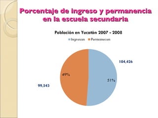 El documento analiza la eficiencia terminal y situación educativa de los adolescentes en Yucatán, México. Reporta que en 2008, el 80.9% de estudiantes completaron la secundaria en Yucatán, comparado con el 81.6% a nivel nacional. También discute las posibles causas por las cuales un porcentaje de adolescentes no continúan sus estudios de nivel medio superior, como problemas económicos, embarazos tempranos y falta de acceso a transporte o escuelas. Finalmente, señala que en 2000, el 10.4%