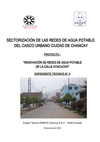 Este documento presenta el proyecto de renovación de las redes de agua potable en la Calle Ayacucho en Chancay, Perú. El proyecto beneficiará a aproximadamente 18,525 habitantes del casco urbano alto y bajo de la ciudad. Se realizaron trabajos de campo como topografía, excavación de calicatas y levantamiento de servicios existentes. El proyecto consiste en la instalación de nuevas tuberías de PVC y accesorios para mejorar la presión y continuidad del servicio de agua potable en el á