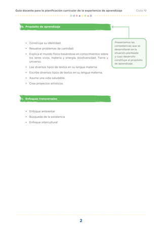 Este documento presenta una guía docente para una experiencia de aprendizaje de tres semanas sobre la prevención de enfermedades y el cuidado de la salud. La guía incluye el planteamiento de la situación, los propósitos de aprendizaje, enfoques transversales, una descripción del producto final (un díptico), competencias, criterios de evaluación, actividades sugeridas y una secuencia de actividades. El objetivo es que los estudiantes aprendan cómo prevenir enfermedades y cuidar su salud y la de sus famil