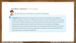 El documento describe una experiencia de aprendizaje sobre estadística. En la primera semana, los estudiantes aprendieron sobre las etapas de un estudio estadístico, incluyendo el desarrollo de encuestas, tablas, gráficos y interpretaciones. En la segunda semana, organizaron información en tablas de frecuencias relacionadas al acceso al agua.
