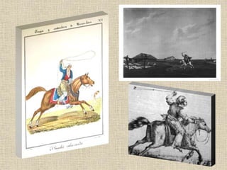 Este documento describe el proceso de producción de tasajo y cueros en los saladeros de la provincia de Buenos Aires durante los siglos XVIII y XIX. Los animales eran sacrificados y procesados en grandes cantidades para producir tasajo mediante salado y secado, y cueros que eran tratados con arsénico para su conservación. El tasajo de baja calidad se exportaba a mercados como Cuba y Brasil, mientras que los saladeros también concentraban una fuerza laboral estacional para llevar a cabo estas tareas industriales de manera