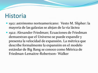La teoría de la expansión acelerada del universo propone que la expansión del universo se está acelerando debido a la energía oscura y la materia oscura. La materia oscura es materia hipotética que no emite luz pero cuya existencia se deduce por sus efectos gravitacionales, mientras que la energía oscura es una forma de energía presente en todo el espacio que causa una fuerza gravitacional repulsiva y acelera la expansión del universo.