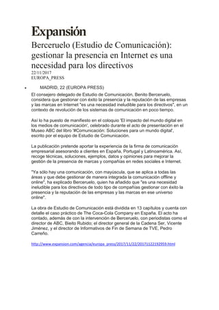 El director ejecutivo de Estudio de Comunicación, Benito Berceruelo, considera que gestionar con éxito la presencia y reputación de las empresas en Internet es una necesidad ineludible para los directivos debido a la revolución de los sistemas de comunicación. La firma publicó el libro '#Comunicación: Soluciones para un mundo digital' para compartir su experiencia asesorando a clientes sobre cómo mejorar la gestión de sus marcas en redes sociales e Internet. Berceruelo explica que las compañías deben gestionar de forma integra