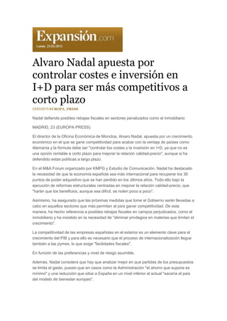 Alvaro Nadal, director de la Oficina Económica de Moncloa, apuesta por controlar costes e invertir en I+D para ganar competitividad a corto plazo. Nadal también defiende posibles rebajas fiscales en sectores como el inmobiliario y eliminar privilegios que limitan el crecimiento. Además, considera necesario analizar mejor en qué partidas de los presupuestos se puede limitar el gasto.