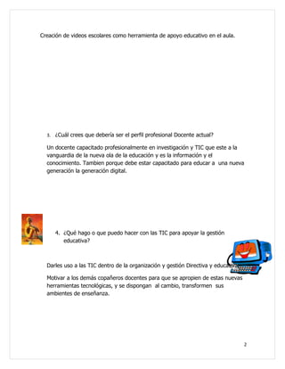 Este documento presenta las expectativas de un docente sobre el uso de las tecnologías de la información y la comunicación (TIC) en su desempeño profesional y en la gestión educativa de su institución. El docente menciona que ha incorporado las TIC en su trabajo mediante el uso de diarios digitales, redes sociales y proyectos pedagógicos con TIC. Además, cree que el perfil del docente actual debe incluir capacitación en investigación e implementación de TIC. Finalmente, propone apoyar la visión digital de