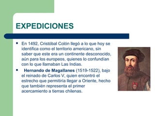 Este documento resume la conquista y colonización de Chile por los españoles. Detalla las expediciones de Diego de Almagro y Pedro de Valdivia, incluyendo la fundación de Santiago en 1541. También describe la resistencia mapuche y la Guerra de Arauco, así como las regulaciones impuestas a los indígenas y los impuestos establecidos por la corona española.