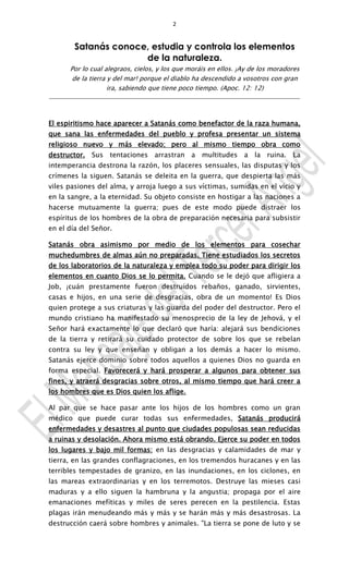El documento analiza el papel de Satanás en los eventos finales del mundo, enfatizando su capacidad para manipular la naturaleza y provocar desastres. Se menciona cómo, a través de tentaciones y calamidades, Satanás distrae a las personas de la preparación espiritual necesaria. Según el autor, la desobediencia humana a las leyes divinas lleva a la retirada de la protección de Dios, permitiendo así que ocurran tragedias en la Tierra.