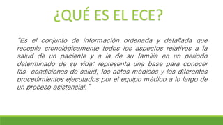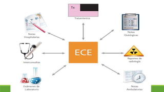 El expediente clínico electrónico (ECE) es un sistema que organiza y almacena de manera digital toda la información de salud de un paciente, permitiendo acceso seguro a múltiples usuarios autorizados. Existen diferentes tipos de ECE como el expediente clínico electrónico (EMR), el expediente electrónico de salud (EHR) y el expediente electrónico del paciente (PHR), cada uno con diversas funcionalidades y usos. Aunque el ECE presenta beneficios como reducción de costos y mejor acceso a la información, también enfrenta desventajas relacionadas con la capacitación del personal y la infraestructura.
