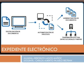 El documento describe las características y beneficios del expediente electrónico. Un expediente electrónico permite la tramitación digital de documentos de forma rápida, descentralizada y legalmente válida. Proporciona transparencia, interoperabilidad, seguridad y firma electrónica. Esto conduce a mayor eficiencia, productividad y menores costos en comparación con los expedientes físicos. La legislación peruana promueve el uso del expediente electrónico y la identidad digital para simplificar los trámites entre ciudadanos y el Estado.
