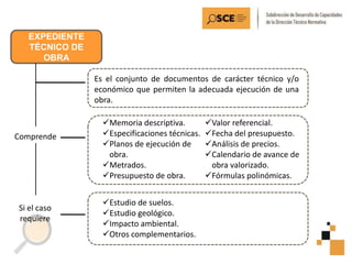 El documento describe los componentes y propósito de un expediente técnico de obra, el cual es el conjunto de documentos técnicos y económicos necesarios para la ejecución de una obra. Un expediente técnico incluye una memoria descriptiva, planos, especificaciones técnicas, metrados, presupuesto, cronograma y otros documentos que permiten la correcta ejecución de la obra. El expediente técnico puede ser elaborado por consultores, la entidad o el ejecutor de la obra, dependiendo del tipo de contrato, y es necesario para la a