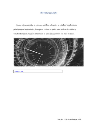 Este documento resume los conceptos clave de la estadística descriptiva y su aplicación para analizar la calidad y variabilidad de un proceso. Explica que la estadística se utiliza para identificar causas e impactos de problemas como las emisiones atmosféricas. También describe los dos tipos principales de variabilidad y las consecuencias de no distinguir entre ellos. Finalmente, destaca la importancia del pensamiento estadístico y cómo la tecnología puede mejorar la capacitación estadística de los directivos.