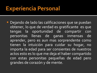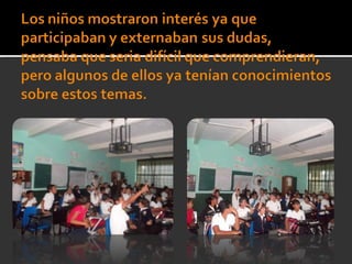 El documento describe una presentación realizada por el autor para niños de primaria sobre el tema del cuidado y ahorro de la energía eléctrica. La presentación fue interactiva, con videos, preguntas y premios para los niños. Los niños mostraron un gran interés en el tema y participaron activamente. El autor se sorprendió por la capacidad de los niños para retener información y comprender la importancia de cuidar el planeta.