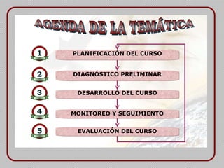 Este documento presenta una agenda para la planificación y desarrollo de un curso de formación de adultos. Incluye etapas como la planificación, diagnóstico preliminar, desarrollo del curso, monitoreo y evaluación. En la planificación se analizan resultados previos y se seleccionan materiales y métodos de evaluación. El diagnóstico incluye encuestas sobre estilos de aprendizaje. El desarrollo contempla clases, tareas de actualidad y comunicación por correo. El monitoreo analiza resultados académicos