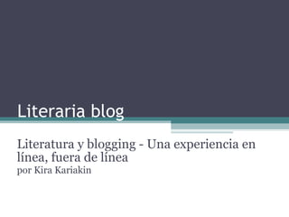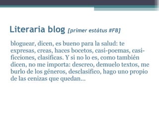 Este documento describe la experiencia del grupo Literaria Blog, un colectivo de blogueros venezolanos con intereses literarios. Se detalla cómo surgió la idea de reunirse periódicamente para leer y comentar blogs literarios. Se resumen 4 encuentros realizados, en los cuales varios miembros leyeron entradas de sus blogs, comentaron el trabajo de otros y conocieron a nuevos blogueros. El grupo busca promover la literatura en blogs y fomentar el intercambio entre sus miembros.