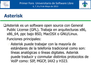 El documento describe un foro universitario de software libre sobre Asterisk que se llevará a cabo del 6 al 9 de mayo de 2013. Se presentará información sobre proyectos de código abierto como Proyecto GNU, FreeBSD y Linux. También habrá experiencias con la versión 1.8 de Asterisk Cert y discusiones sobre la historia, productos, funcionalidades y arquitectura de Asterisk.