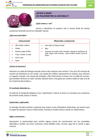 El documento presenta 7 experiencias de laboratorio que se pueden realizar de 1ro a 4to año. Cada experiencia incluye los materiales necesarios y los pasos a seguir. La primera experiencia muestra bolitas de naftalina que ascienden y descienden en un líquido debido a burbujas de dióxido de carbono. La segunda usa zumo de lechuga morada como indicador para identificar sustancias ácidas o básicas. La tercera produce una efervescencia al mezclar bicarbonato y vinagre dentro de un glo